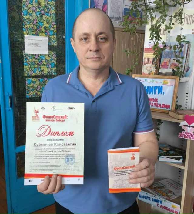 Константин Константинович Кузмичев написал 12 стихотворений, одно из которых вошло в сборник «ФотоСтихия». Это не просто стихи, это слова поддержки, тепла и веры, которые так необходимы нашим защитникам. Константину Константиновичу Кузмичеву вручили сборник лучших произведений стихотворений участников литературно-художественного патриотического проекта.Этот проект, реализованный издательским домом «Советская Сибирь» и поддержанный министерством культуры, в котором фотографии из архива издания стали поводом для рождения новых стихов о войне и Победе, Родине и ее защитниках. 80 архивных фотографий вдохновили 165 авторов на 737 стихотворений — это настоящий диалог поколений о любви к родному краю.