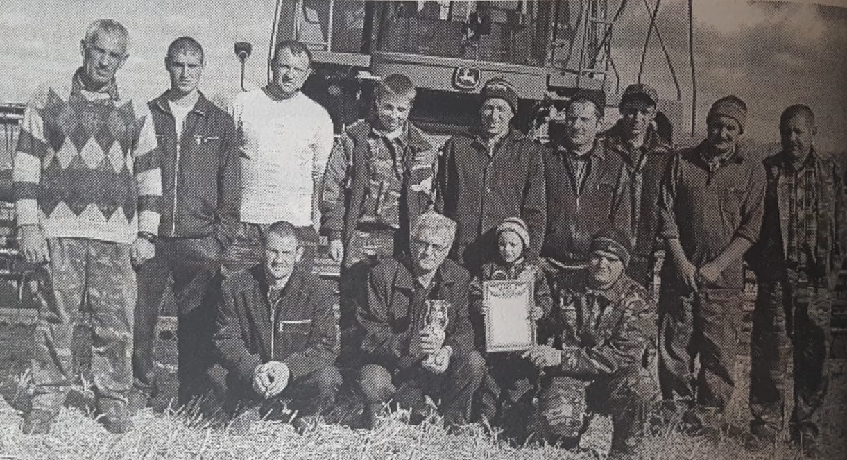 На фото коллектив механизаторов ООО «Рубин» во главе с директором Е. К. Кином после вручения Кубка жатвы «Краснозерской нови»