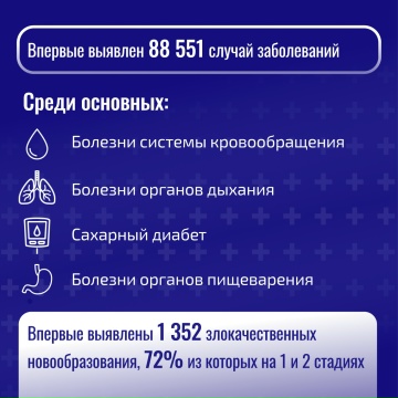 В Новосибирской области в 2025 году первый этап диспансеризации и профосмотры прошли порядка 1,2 млн человек, своевременно выявлены более 88,5 тыс. новых случаев заболеваний. Большинство из них – болезни системы кровообращения, в том числе связанные с повышенным артериальным давлением, болезни органов дыхания и сахарный диабет. Также удалось выявить злокачественные новообразования, 72 % – на ранних стадиях.