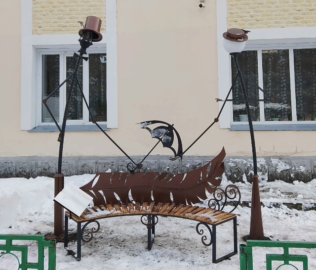 Скамья в виде пера побуждает читателя вооружиться томиком излюбленных стихотворений или же прозаических творений, присесть на скамью и насладиться чтением на свежем воздухе. Над лавочкой, трогательно склонились друг к другу необычные персонажи — фонари в образе изящной дамы и элегантного джентльмена.