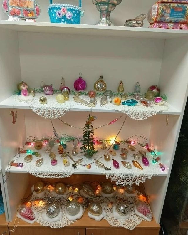 Теперь на стеллажах красуются ёлочные игрушки и другие новогодние украшения советского периода.